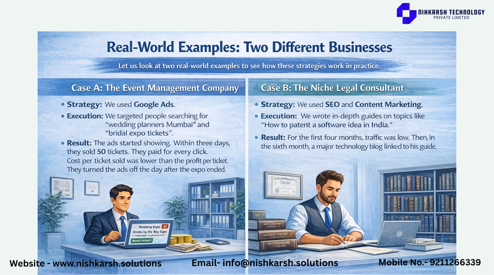 Let us look at two real-world examples to see how these strategies work in practice. Case A: The Event Management Company An event management company in Mumbai approached us three weeks before a wedding expo. They needed to sell tickets. Strategy: We used Google Ads. Execution: We targeted people searching for wedding planners Mumbai and bridal expo tickets. Result: The ads started showing. Within three days they sold 50 tickets. They paid for every click. The cost per ticket sold was lower than the profit per ticket. They turned the ads off the day after the expo ended. Case B: The Niche Legal Consultant A lawyer specializing in Intellectual Property rights wanted to build a long-term reputation. He did not need a client today; he needed to be the recognized expert by the time a startup needed a patent six months later. Strategy: We used SEO and Content Marketing. Execution: We wrote in-depth guides on topics like How to patent a software idea in India. Result: For the four months traffic was low. Then in the month a major technology blog linked to his guide. His rankings skyrocketed. Now two years later he receives five consultation requests per week directly from that single article—at zero cost per click.