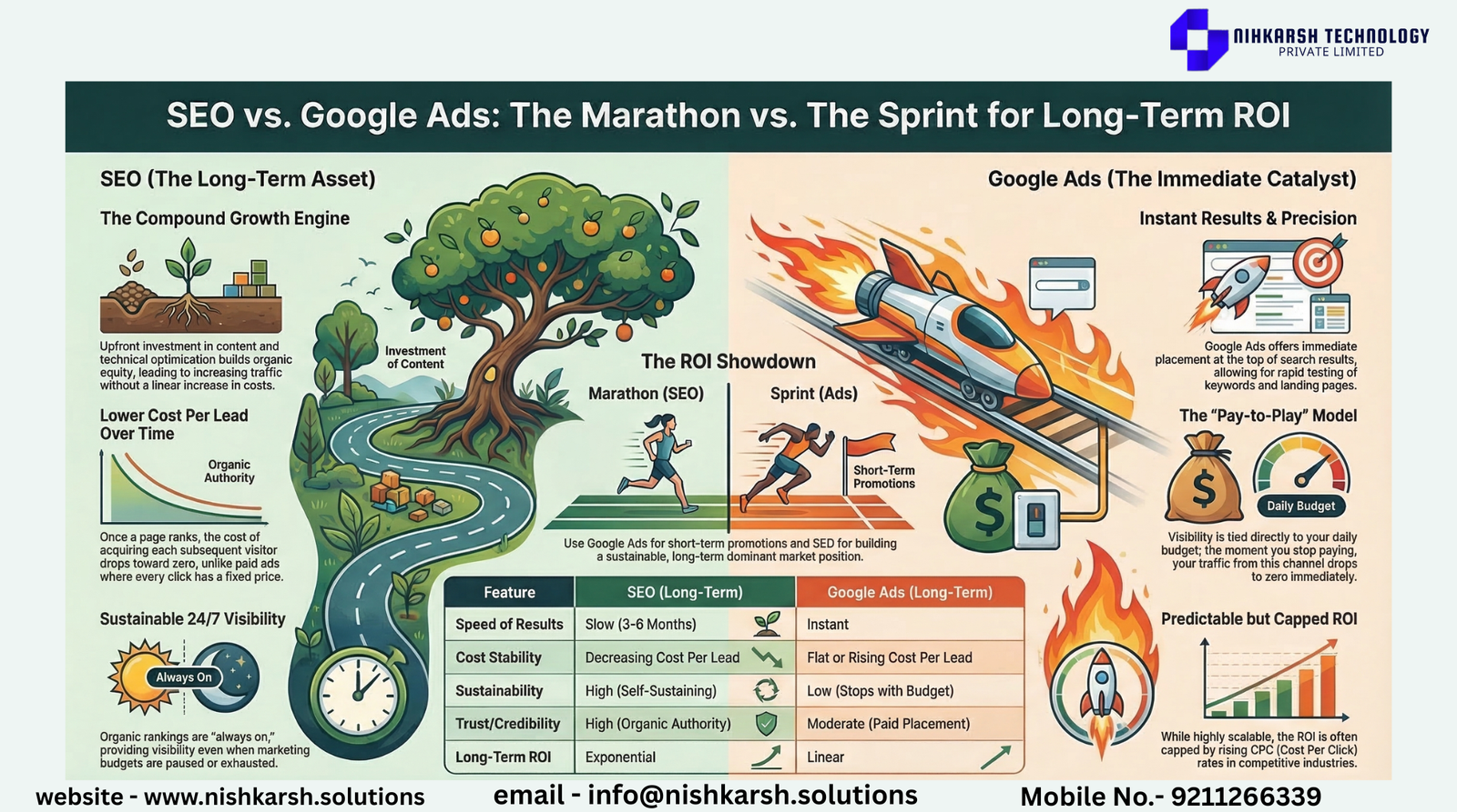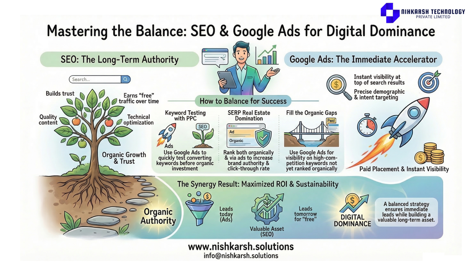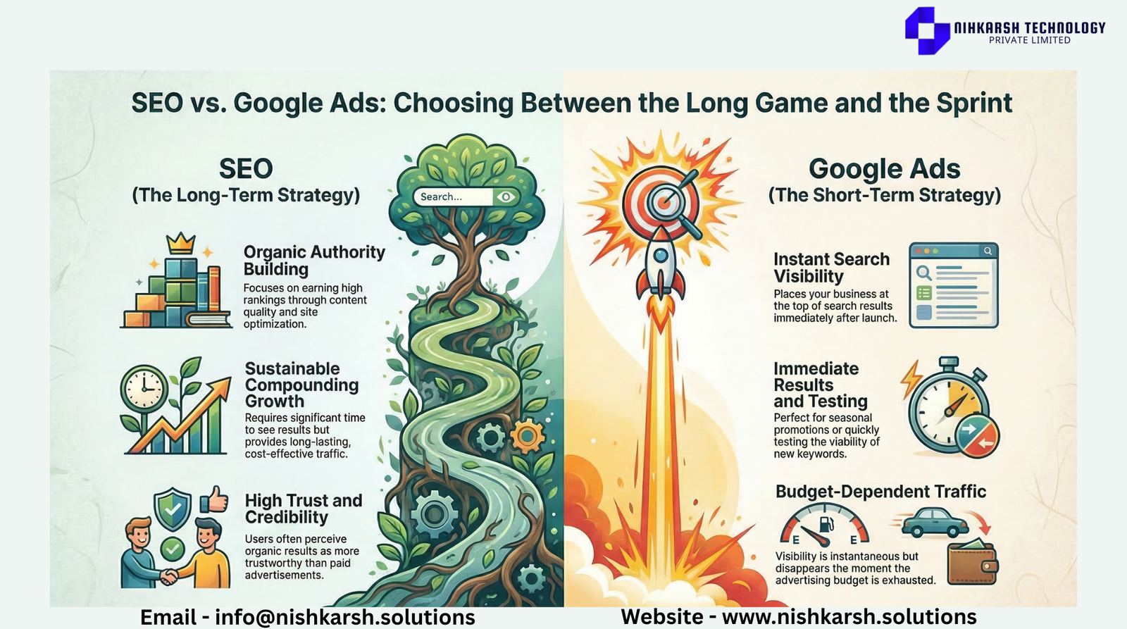 Feeling overwhelmed by algorithms and auction prices? You do not have to figure this out. At Nishkarsh Solutions we specialize in building custom digital marketing strategies that balance the wins of Google Ads with the lasting power of SEO. Whether you need traffic today or authority for tomorrow we can build the roadmap that fits your budget. Stop guessing. Start growing. Visit us today: www.nishkarsh.solutions Call us for a consultation: 9211266339