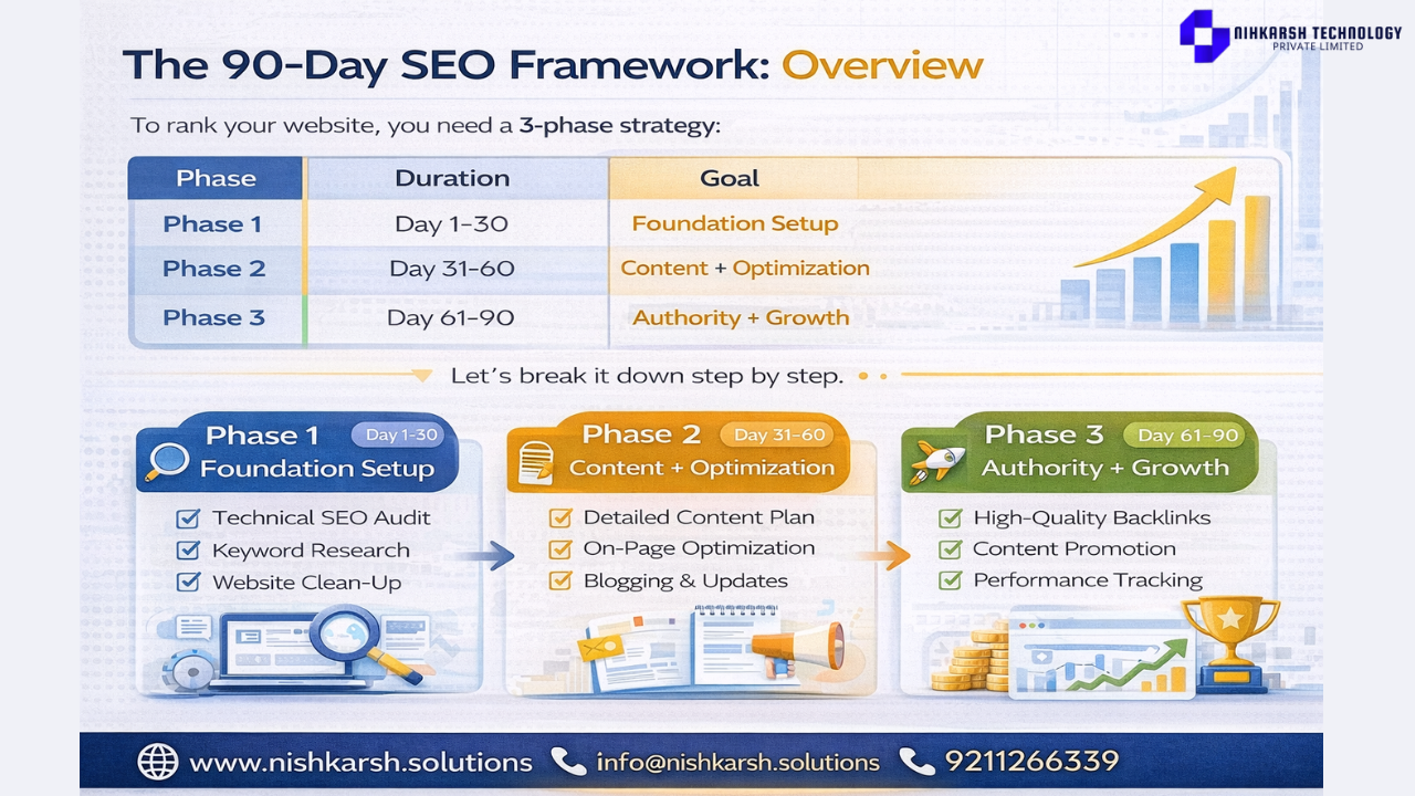 | Phase | Duration | Goal | | ------- | --------- | ---------------------- | | Phase 1 | Day 1–30 | Foundation Setup | | Phase 2 | Day 31–60 | Content + Optimization | | Phase 3 | Day 61–90 | Authority + Growth |